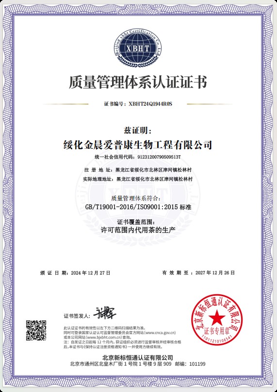 綏化金晨愛普康生物工程有限公司位于黑龍江省中南部地區(qū)的綏化市北林區(qū),所處位置東經(jīng)124度,北緯45度,位于松嫩平原的呼蘭河流域,“有寒地黑土,塞北江南”的美譽(yù),是全國(guó)重要的商品糧基地,屬中溫帶大陸性季風(fēng)氣候,四季分明,雨熱同期,冬季冰雪覆蓋,夏季降雨集中氣候溫?zé)釢駶?rùn)。綏化金晨愛普康生物工程有限公司是一家專業(yè)從事健康養(yǎng)生產(chǎn)品研發(fā)、生產(chǎn)及銷售企業(yè),公司占地總面積8000平方米,建筑面積5000平方米,公司周圍無(wú)任何污染源,是食品生產(chǎn)基地。公司生產(chǎn)車間潔凈度級(jí)別達(dá)到10萬(wàn)級(jí),同時(shí)擁有數(shù)十臺(tái)先進(jìn)的生產(chǎn)設(shè)備及高科技檢驗(yàn)儀器,從產(chǎn)品的原輔料、中間品、成品到銷售的全過(guò)程嚴(yán)格把關(guān),使生產(chǎn)中每道工序都符合產(chǎn)品的高標(biāo)準(zhǔn)要求,從而保證了公司生產(chǎn)的每一袋產(chǎn)品合格,無(wú)質(zhì)量缺陷。綏化金晨愛普康生物工程有限公司率先采用了企業(yè)資源ERP管理系統(tǒng),肩負(fù)著養(yǎng)生產(chǎn)業(yè)的重要課題,同時(shí)又是江蘇省國(guó)家藥用植物重點(diǎn)實(shí)驗(yàn)中心科研成果轉(zhuǎn)化的生產(chǎn)試驗(yàn)基地,公司核心成員均為本科以上學(xué)歷。生產(chǎn)的產(chǎn)品有近五十個(gè)品種的代用茶產(chǎn)品,公司先后通過(guò)HALAL國(guó)際認(rèn)證,編號(hào)為SSPY-201318-33849;ISO9001質(zhì)量管理體系認(rèn)證編號(hào)為XBH···